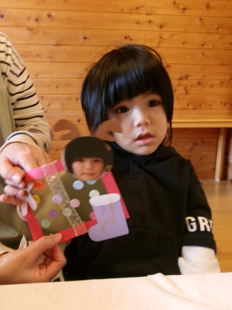 最後に、お子さんたちの顔写真をフレームに付け、リボンを結ぶと…