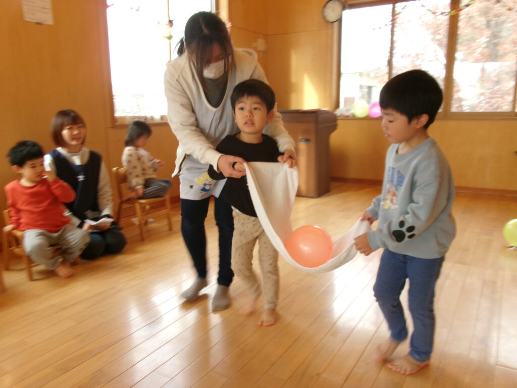 運動メニューはクリスマスver.で行いました☆  ☝サンタの顔が貼ってある風船を煙突まで運んでいる様子です♪