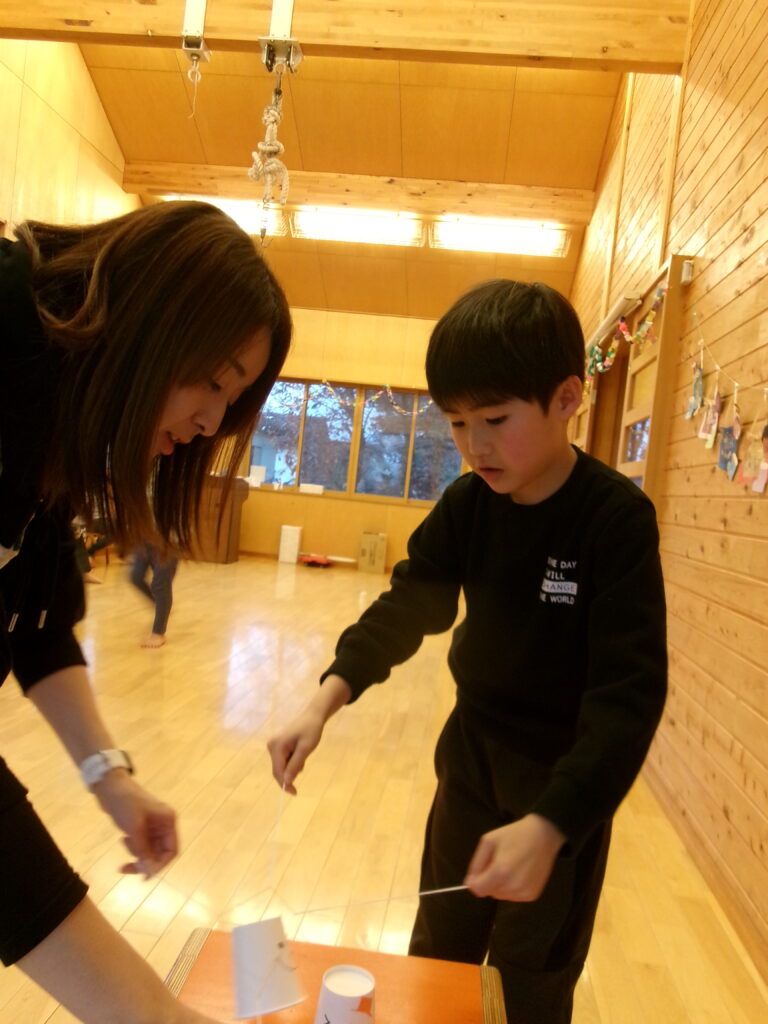 ☝輪ゴムにひもを付けて協力して紙コップを運ぶゲームを行いました! 難しさもありつつ楽しいゲームを沢山行いました☺