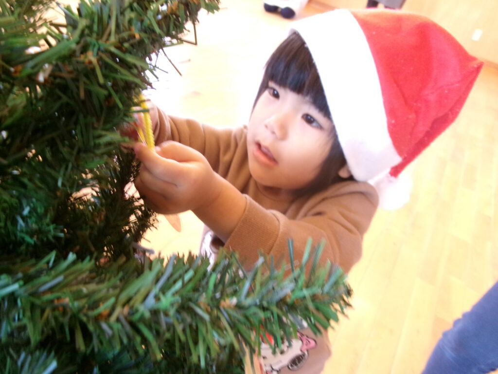 サンタやトナカイの帽子を被り、ツリーにオーナメントを飾りました🎄