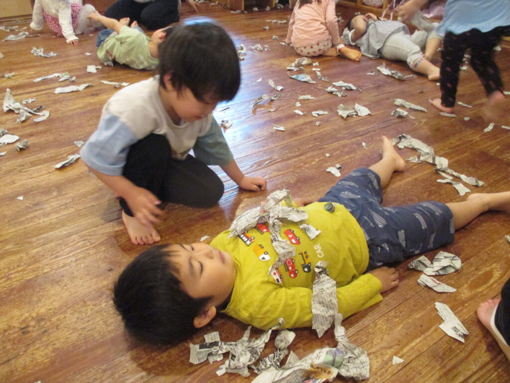 くまぐみ(3歳児) 新聞のお布団 かけてあげるね♪
